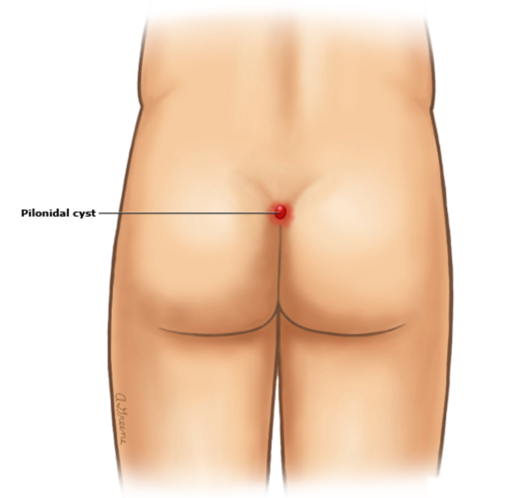 This is a common condition which typically afflicts patients between the ages of 15-45, with men being affected 2-4 times more often than women. Theories to its causes have varied over the years, but the most agreed-upon concept has at its basis the gluteal cleft. As the skin stretches over the cleft with sitting and standing small breaks occur which allow sharp hairs to embed under the skin. The hairs get drawn deeper into the tissue by negative pressure, creating tracts (sinuses or “pits”). These can collect debris and more hair creating a cyst, which can then become infected, creating an abscess. Chronic infection and inflammation can develop, creating persistent drainage and discomfort.